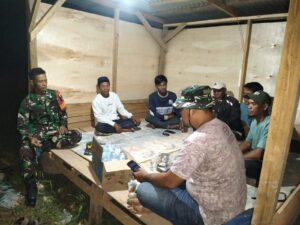 Dalam giat ini Sertu Hendi menyambangi warga yang sedang bertugas jaga di pos kamling serta memberi himbauan dan arahan.