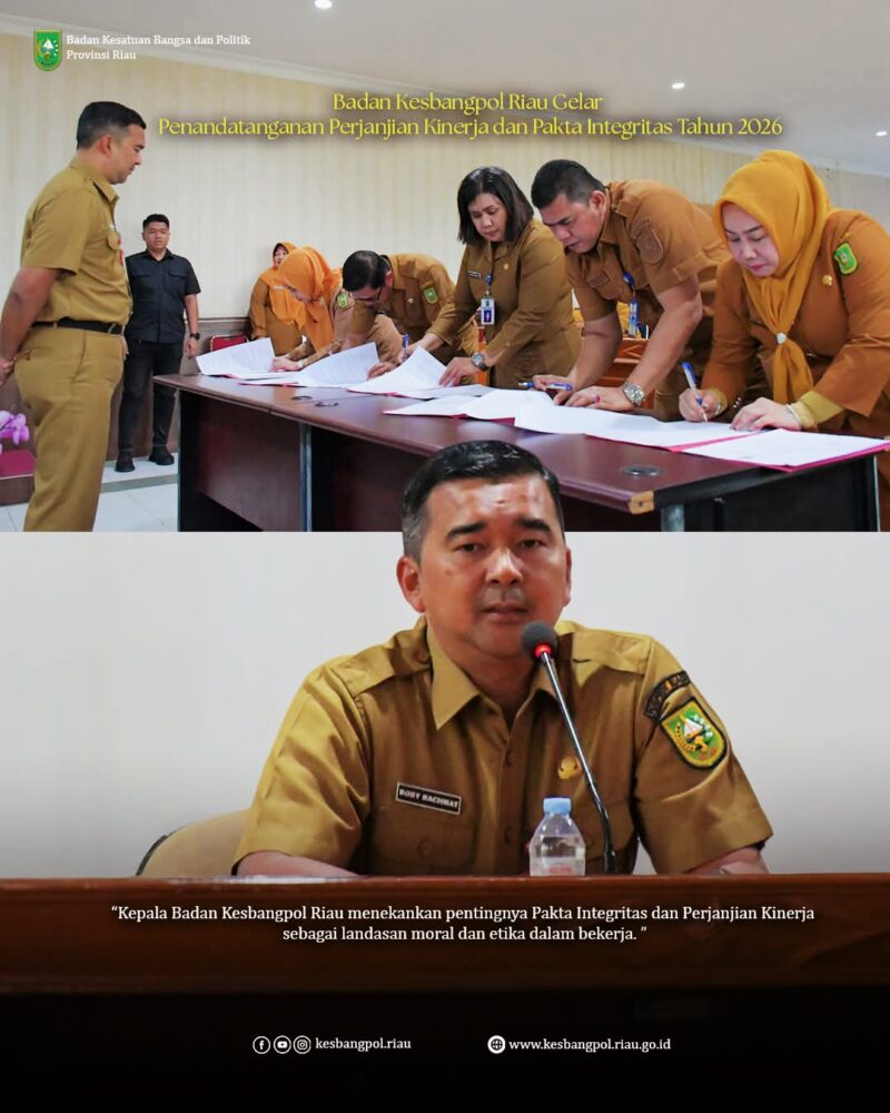 Pekanbaru, baranewsriau.com – Badan Kesatuan Bangsa dan Politik (Kesbangpol) Provinsi Riau melaksanakan Penandatanganan Perjanjian Kinerja dan Pakta Integritas Tahun 2026 pada Senin, 19 Januari 2026, di Aula Lantai III Kantor Badan Kesbangpol Provinsi Riau. Kegiatan ini diikuti oleh seluruh Aparatur Sipil Negara (ASN) di lingkungan Badan Kesbangpol Provinsi Riau. Selasa (20/01/2026).Kepala Badan Kesbangpol Provinsi Riau menegaskan bahwa penandatanganan Perjanjian Kinerja dan Pakta Integritas bukan sekadar seremonial, melainkan wujud komitmen bersama untuk meningkatkan kinerja, menjaga integritas, serta memberikan pelayanan terbaik kepada masyarakat.