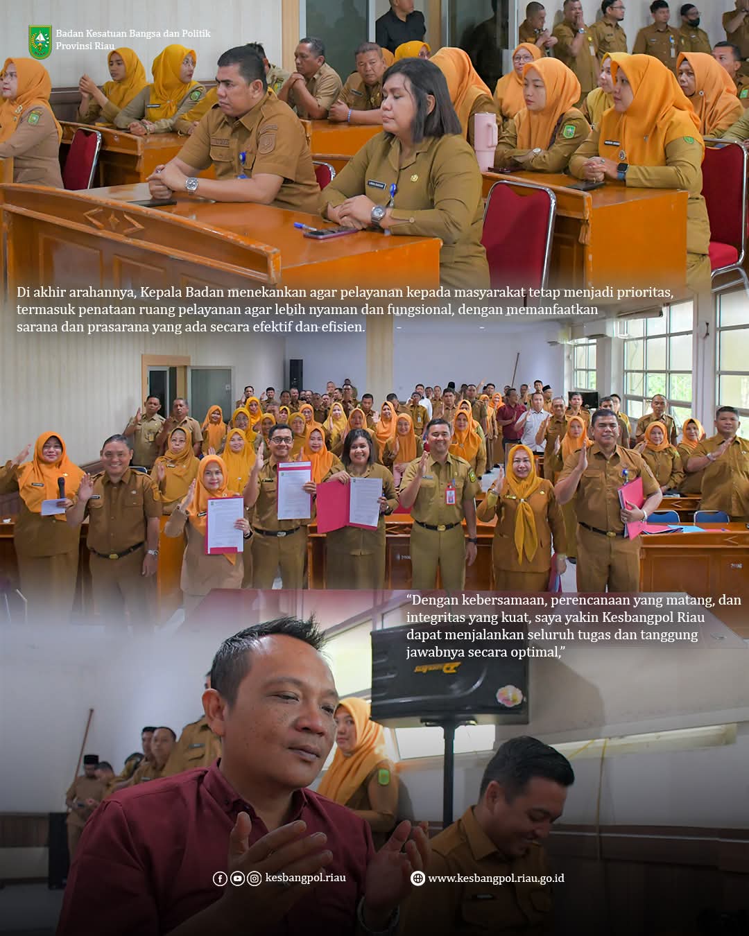 “Melalui kegiatan ini, diharapkan seluruh ASN semakin profesional, berintegritas, serta konsisten menjalankan tugas dan tanggung jawab guna mewujudkan tata kelola pemerintahan yang bersih, efektif, dan berorientasi pada hasil,” ujar Kepala Badan Kesbangpol Provinsi Riau.
