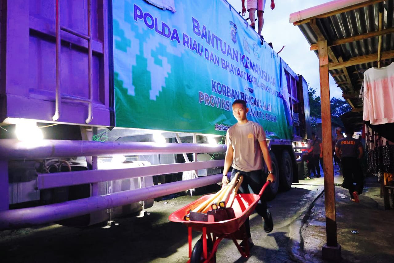 Kabupaten Agam-Sumbar,  baranewsriau.comRibuan sekop, cangkul, dan gerobak dorong bantuan dari Polda Riau telah tiba di Kecamatan Palembayan, Kabupaten Agam, Sumatera Barat. Bantuan tersebut disiapkan untuk mempercepat pembersihan dan pemulihan pascabencana. Minggu (7/12/2025).Bantuan tersebut tiba di Posko Polda Riau, di SMP Negeri 3 Palembayan, Sabtu (6/12/2025) sore setelah menempuh perjalanan belasan jam dari Kota Pekanbaru, Riau. Bantuan tersebut diangkut 2 unit truk Fuso.