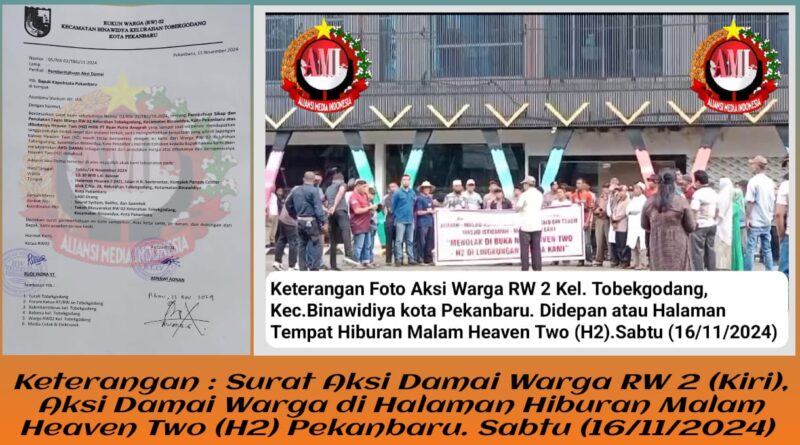 PEKANBARU —- Sabtu (16/11), Warga RW 2 lakukan Aksi Damai didepan (Halaman)Heaven Two (H2) yang diduga dikelola oleh PT Ryan Putra Anugrah yang berlokasikan Jl HR Soebrantas Komplek Panam Center Blok C No 28, Kelurahan Tobekgodang Kecamatan Binawidiya kota Pekanbaru Provinsi Riau.