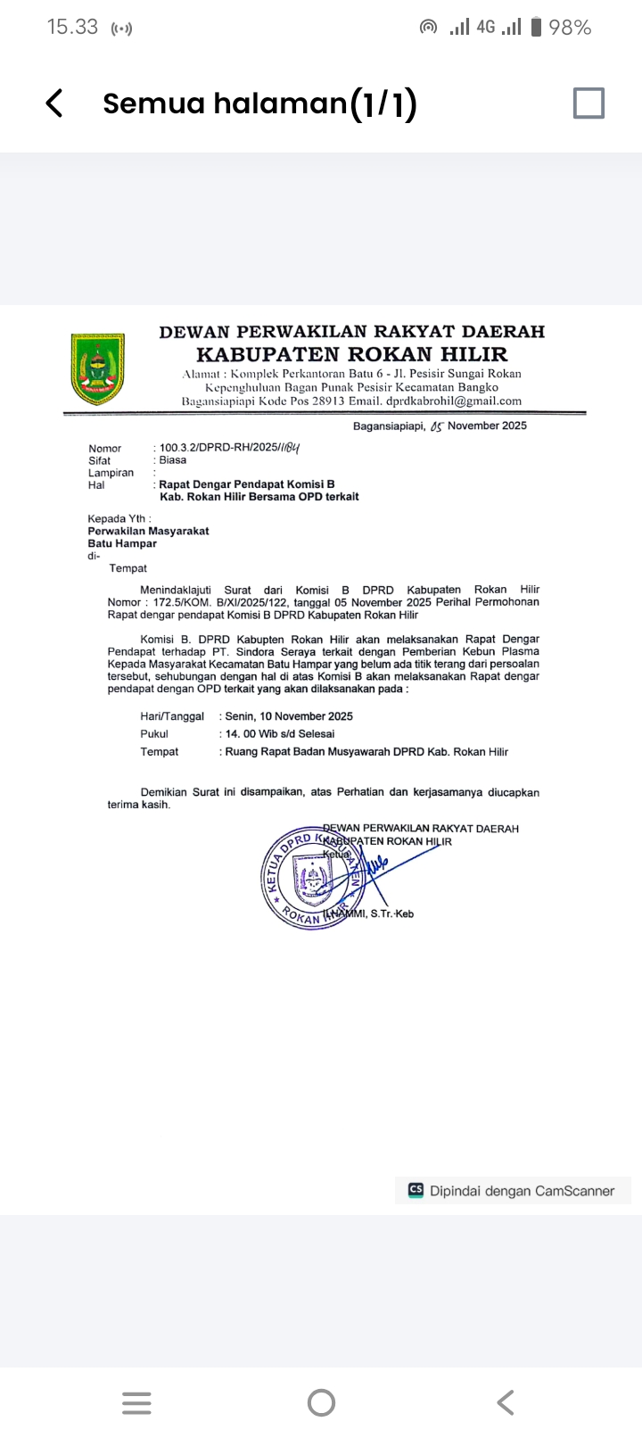 Rapat tersebut akan dihadiri oleh Komisi B DPRD Rohil, tokoh masyarakat Batu Hampar, serta OPD terkait, untuk membahas belum terealisasinya kebun plasma yang menjadi hak masyarakat sekitar.