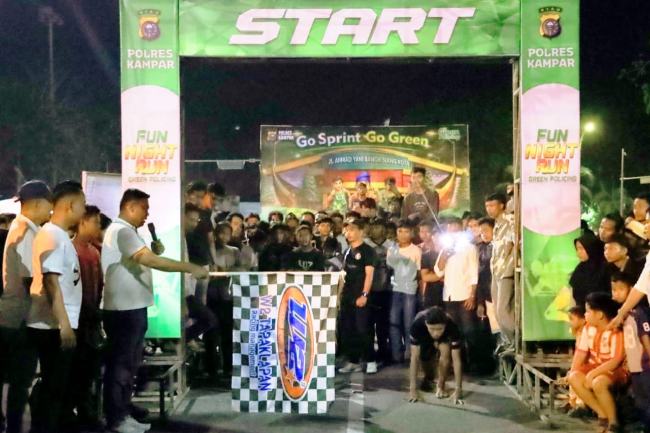Bangkinang, baranewsriau.comPolres Kampar bekerja sama dengan Wendi Tapak Lapan menyelenggarakan Balap Lari Green Policing di Bangkinang Kota pada Sabtu malam (28/02/2026). Kegiatan ini digelar untuk mengalihkan perhatian pemuda dari balap liar dan mengajak mereka mengisi waktu dengan hal positif.