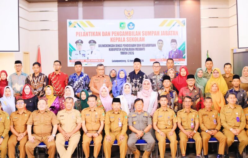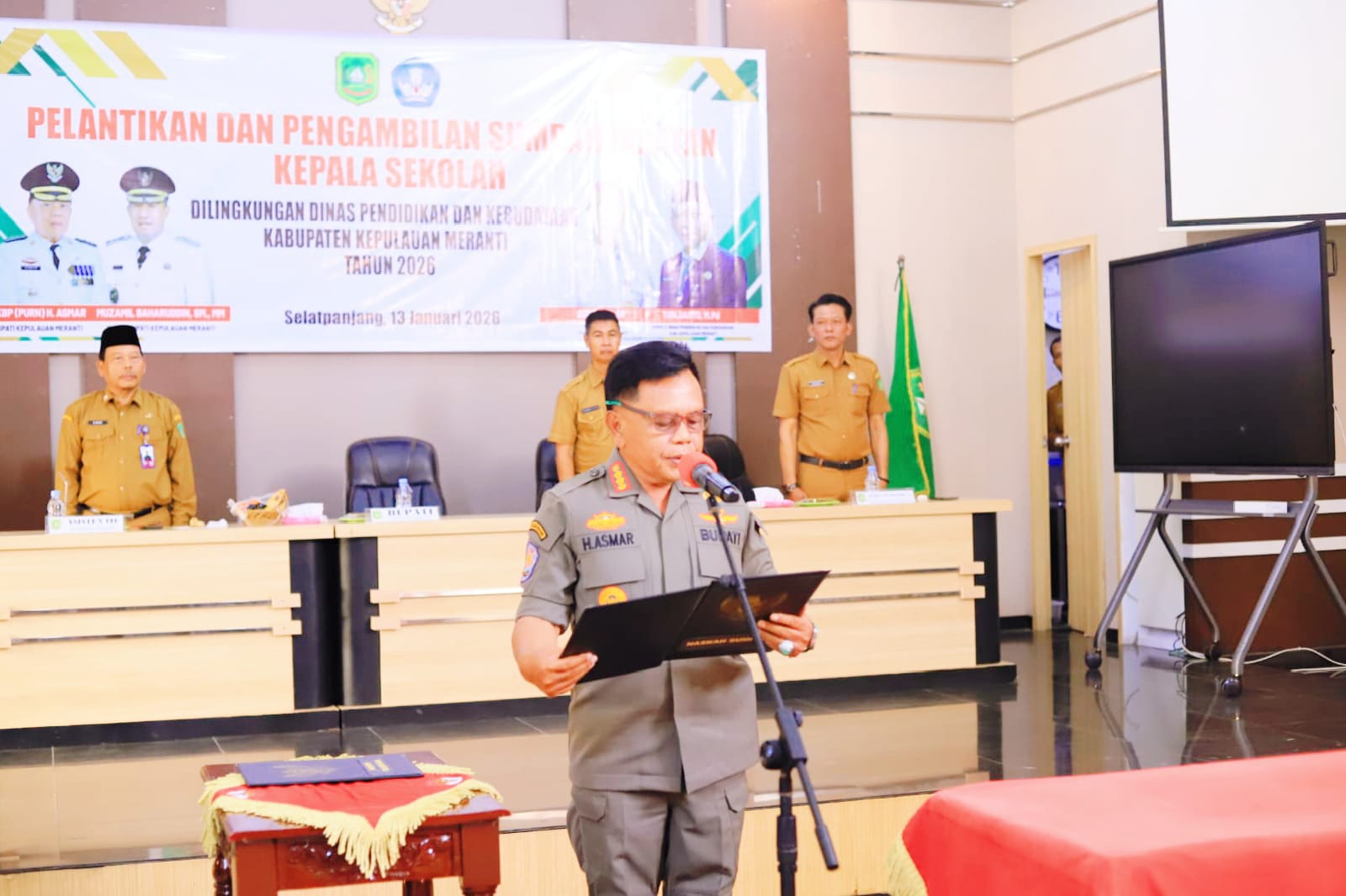 Selatpanjang-Riau, baranewsriau.com – Bupati Kepulauan Meranti, AKBP (Purn) H. Asmar, secara resmi melantik dan mengambil sumpah jabatan Kepala Sekolah definitif di seluruh kecamatan se-Kabupaten Kepulauan Meranti. Kegiatan tersebut berlangsung di Aula Gedung Kuning, Selasa (13/01/2026).