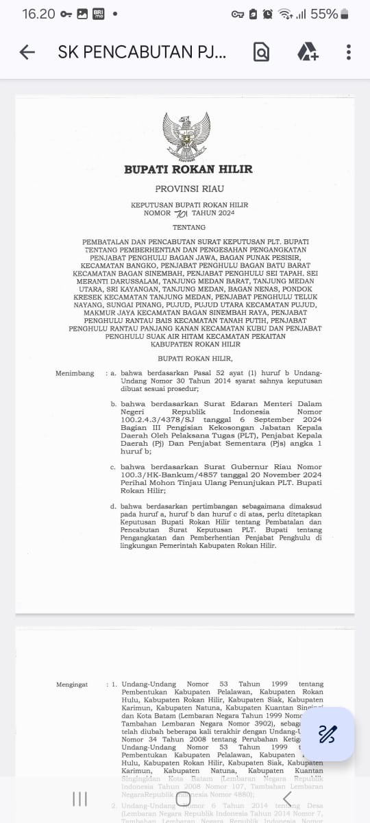 Rohil – baranews, – Pemerintah Kabupaten Rokan Hilir resmi mencabut sejumlah Surat Keputusan (SK) terkait pengangkatan penjabat penghulu di beberapa wilayah. Keputusan ini dituangkan dalam Surat Keputusan Bupati nomor 701 Tahun 2024 yang membatalkan SK sebelumnya, yang mencakup penjabat penghulu di lebih dari 20 kepenghuluan, termasuk Kepenghuluan Suak Air Hitam di Kecamatan Pekaitan. 25 November 2024.
