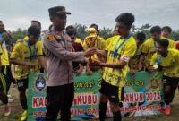 Kapolsek Kubu Iptu Kodam F Sidabutar SH.MH saat menyerahkan Piala bergilir pada juara pertama kesebelasan Bhayangkara. Rohil – baranews.Kapolsek Kubu Iptu Kodam F Sidabutar…