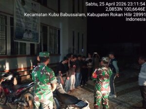 Rohil BaraNews, —– Dalam rangka menciptakan wilayah yang aman dan bebas dari segala bentuk kejahatan serta peredaran narkoba, Personil Koramil 04/Kubu bersama Pihak Kepolisian dari Polsek Kubu ,Upika dan Forum Peduli Penyakit masyarakat melaksanakan kegiatan Patroli bersama.
