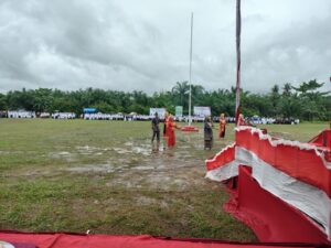 Walau cuaca di lapangan kondisi mendung dan hujan gerimis namun semangat dari pada santri yang mengikuti kegiatan upacara tetap bersemangat tinggi.