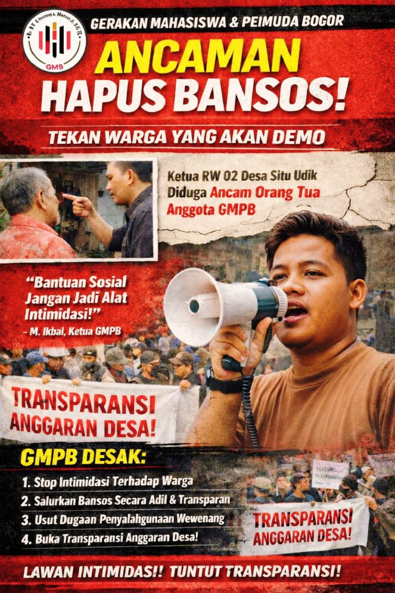 Bogor, baranewsriau.com – Gerakan Mahasiswa dan Pemuda Bogor (GMPB) menyayangkan adanya dugaan tindakan intervensi yang dilakukan oleh Ketua RW 02 Desa Situ Udik terhadap salah satu orang tua anggota GMPB pada hari Rabu 01 April 2026. Dugaan tersebut berupa ancaman penghapusan bantuan sosial (bansos) apabila yang bersangkutan tetap ikut serta dalam aksi unjuk rasa yang dilakukan GMPB terkait tuntutan transparansi anggaran desa. Kamis (02/04/2026).