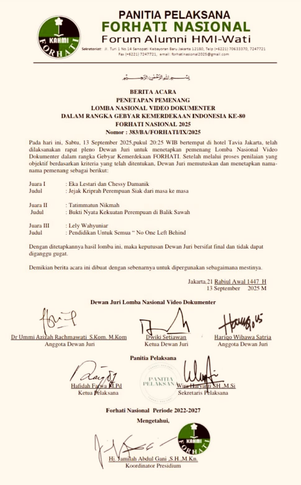 Eka Lestari dan Chessy Damanik akan diundang untuk menerima hadiah pada tanggal 5 Oktober 2025 di Jakarta.