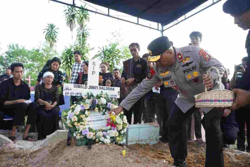 PEKANBARU | Suasana haru menyelimuti pemakaman Iptu (Anumerta) Donald Junus Halomoan, anggota Brimob Polda Riau yang gugur saat menjalankan tugas memadamkan kebakaran hutan dan lahan (karhutla) di wilayah Rokan Hilir, Provinsi Riau. Ia dimakamkan pada Kamis sore, 7 Agustus 2025, di Tempat Pemakaman Umum Umban Sari, Rumbai, Kota Pekanbaru. Prosesi pemakaman dilangsungkan secara kedinasan, sebagai bentuk penghormatan terakhir negara atas pengabdian Donald sebagai Bhayangkara sejati yang wafat dalam tugas.