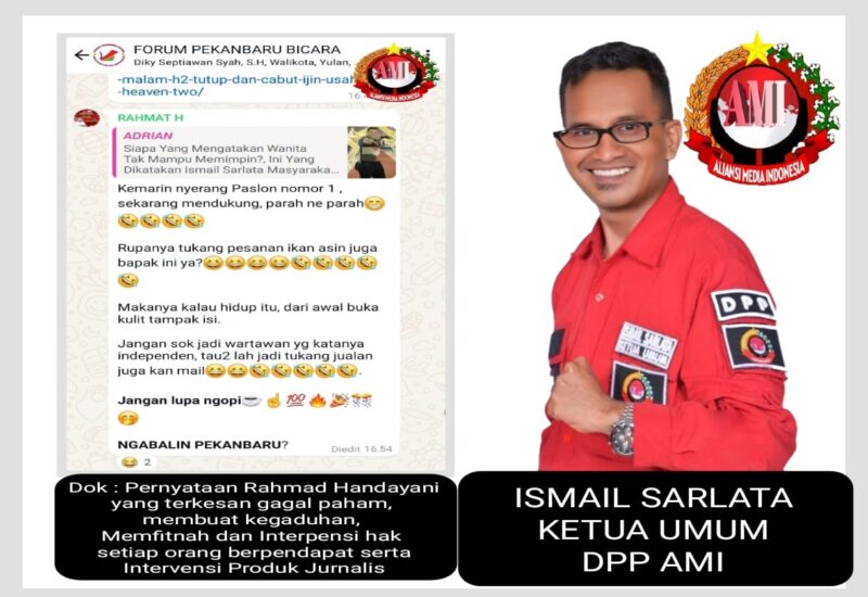 PEKANBARU —- Ismail Sarlata selaku masyarakat Kecamatan Rumbai kota Pekanbaru, dan selaku Ketua Umum Dewan Pimpinan Pusat Aliansi Media Indonesia (DPP AMI) sesalkan pernyataan atau komen Rahmad Handayani yang dikenal sebagai pemilik media online oleh Masyarakat, Pemerintah dan dikalangan Pers yang ada di kota Pekanbaru.