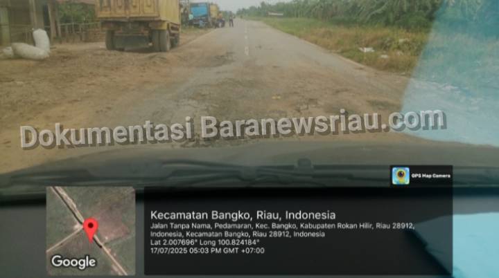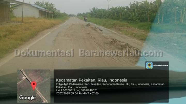 PEKAITAN, Baranewsriau.com | Jalan Poros Pedamaran Kecamatan Pekaitan Kabupaten Rokan Hilir (Rohil) Provinsi Riau, terpantau dalam keadaan rusak parah, Kamis (17/07/2025).