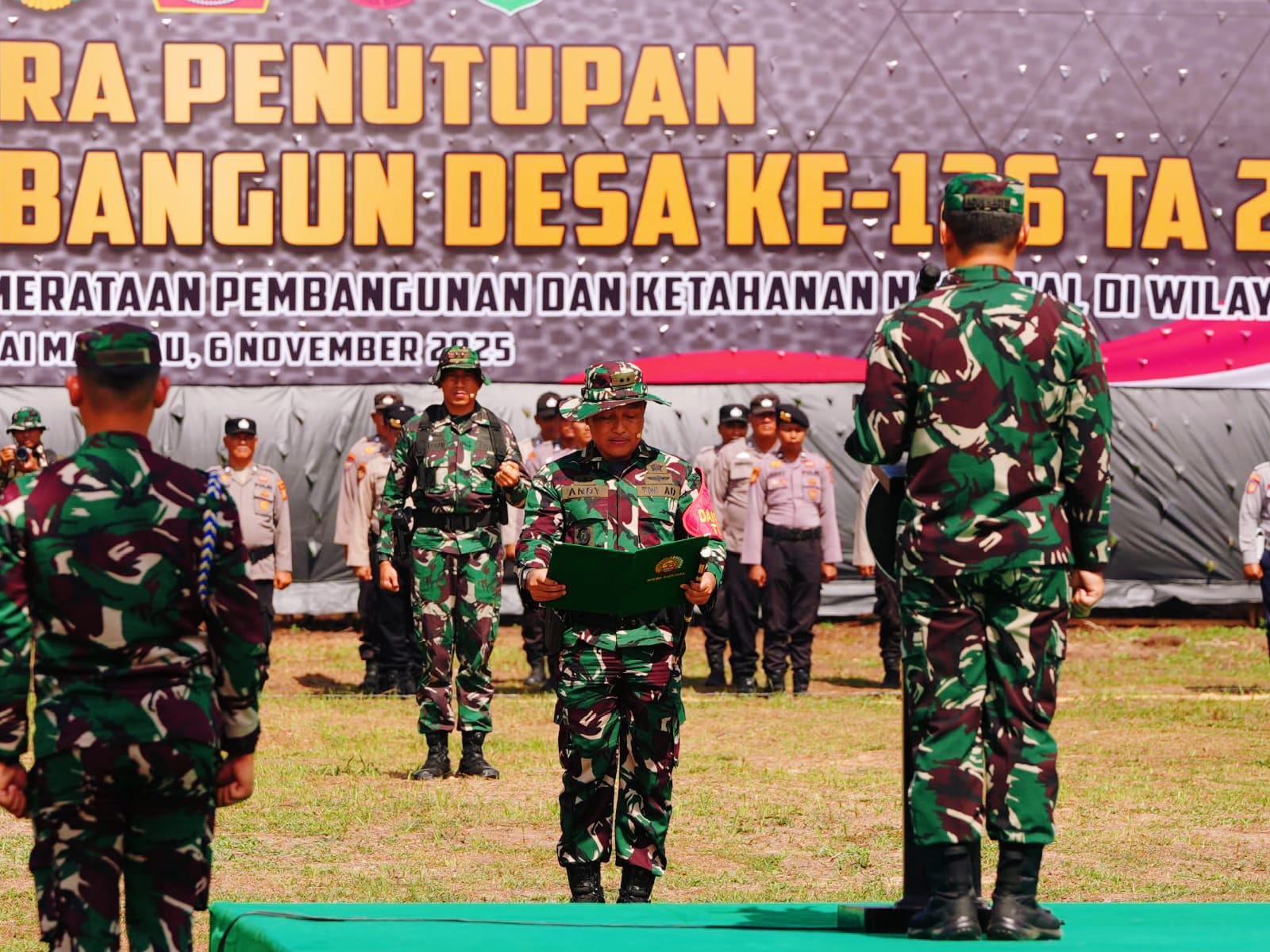 Siak-Riau, baranewsriau.comPangdam XIX/Tuanku Tambusai, Lapangan Sepak Bola Kampung Muara Kelantan, Kecamatan Sungai Mandau, Kabupaten Siak, menjadi saksi sejarah berakhirnya kegiatan TNI Manunggal Membangun Desa (TMMD) ke-126 Tahun Anggaran 2025 Kodim 0322/Siak, yang secara resmi ditutup oleh Pangdam XIX/Tuanku Tambusai Mayjen TNI Dr. Agus Hadi Waluyo, S.A.P., M.M., CHRMP. Kamis (6/11/2025).Upacara penutupan yang berlangsung khidmat yang dihadiri sekitar 750 orang tamu undangan, terdiri dari unsur Forkopimda, pejabat TNI-Polri, pemerintah daerah, OPD, pelajar, hingga masyarakat Kecamatan Sungai Mandau. Turut hadir Danrem 031/WB Brigjen TNI Jarot Suprihanto, para pejabat utama Kodam XIX/TT, serta Bupati Siak Dr. Afni Z, S.A.P., M.Si.