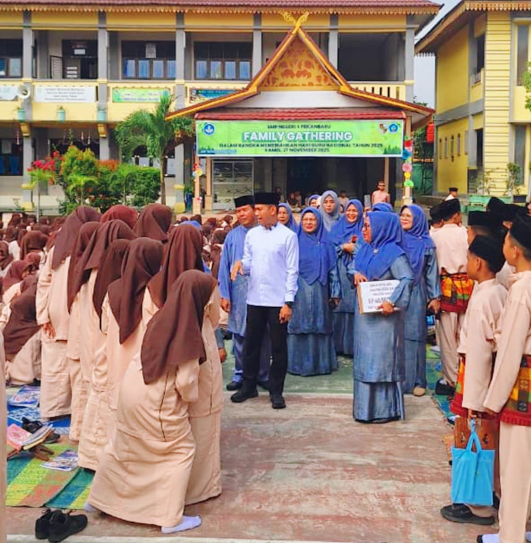 Pekanbaru, baranewsriau.com – Kepala Dinas Pendidikan (Kadisdik) Kota Pekanbaru, Masykur Tarmizi, S.STP., M.Si., meninjau pelaksanaan Imtaq/PCA di SMP Negeri 4 Pekanbaru, sekaligus menyerahkan donasi dari keluarga besar SMP Negeri 4 Pekanbaru untuk korban bencana alam di Aceh, Sibolga, dan Sumatra Barat. Jumat (5/12/2025).