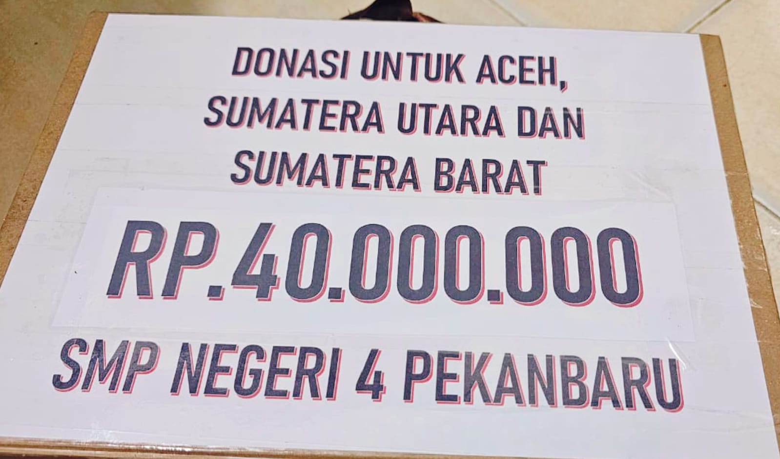 Donasi yang terkumpul sebanyak Rp 40.000.000,- ini merupakan hasil dari pengumpulan dana yang dilakukan oleh siswa-siswi, orangtua siswa, guru, dan tenaga kependidikan (TU) SMP Negeri 4 Pekanbaru.