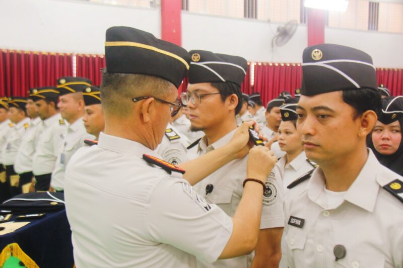 Prosesi dilanjutkan dengan penyematan tanda pangkat baru kepada perwakilan pegawai yang naik pangkat, disaksikan oleh seluruh peserta upacara.