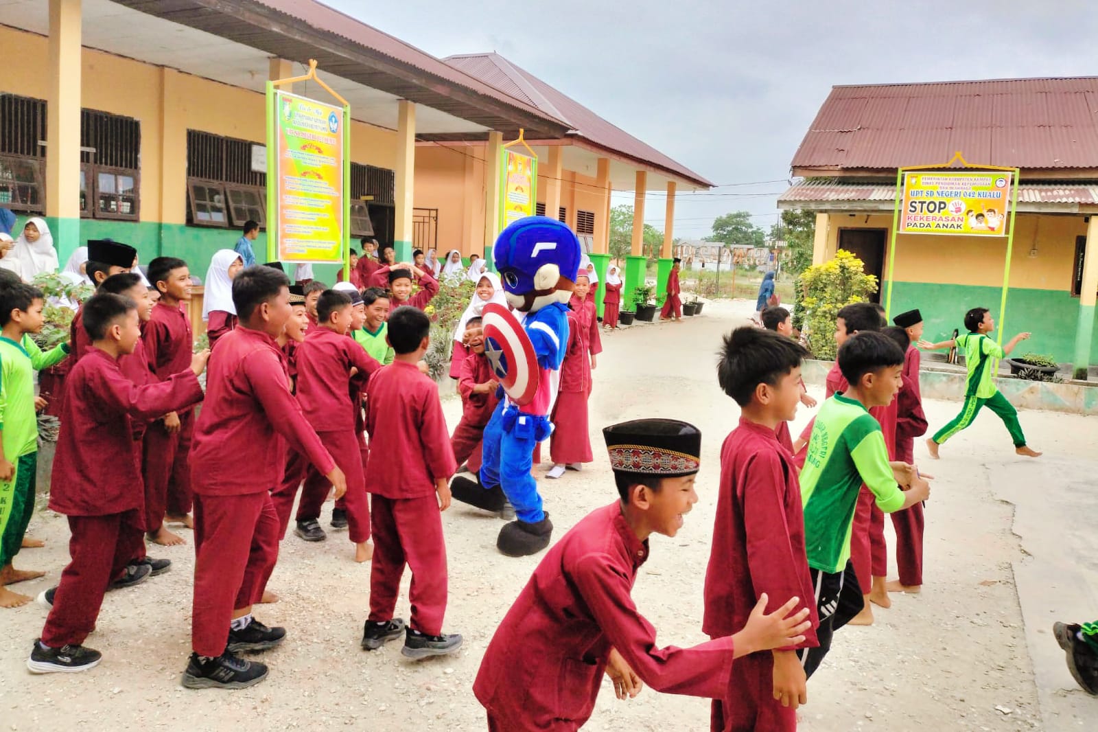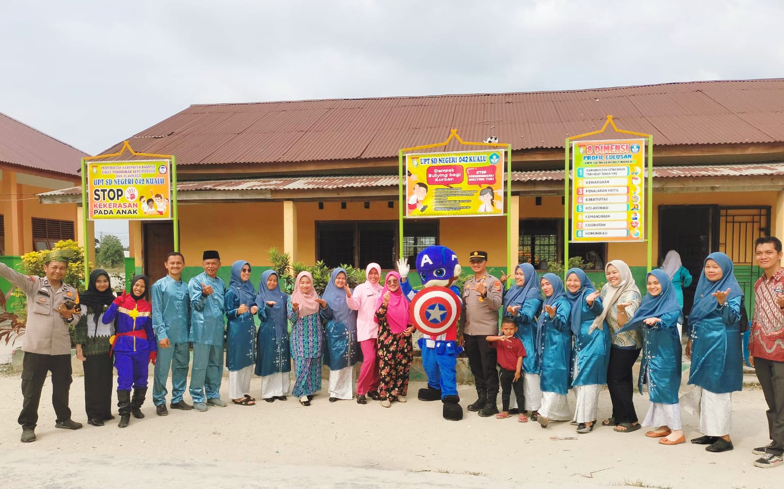 Setibanya di SD Negeri 042 Kualu, tim disambut dengan meriah oleh Kepala Sekolah SD Negeri 042 Ibu Ismanuria, S.Pd., Majelis Guru, dan siswa-siswi SD Negeri 042 Kualu.