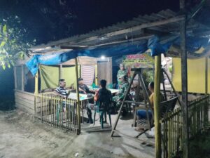 Dalam giat ini Sertu Kimur menyambangi warga yang sedang bertugas jaga di pos kamling serta memberi himbauan dan arahan.