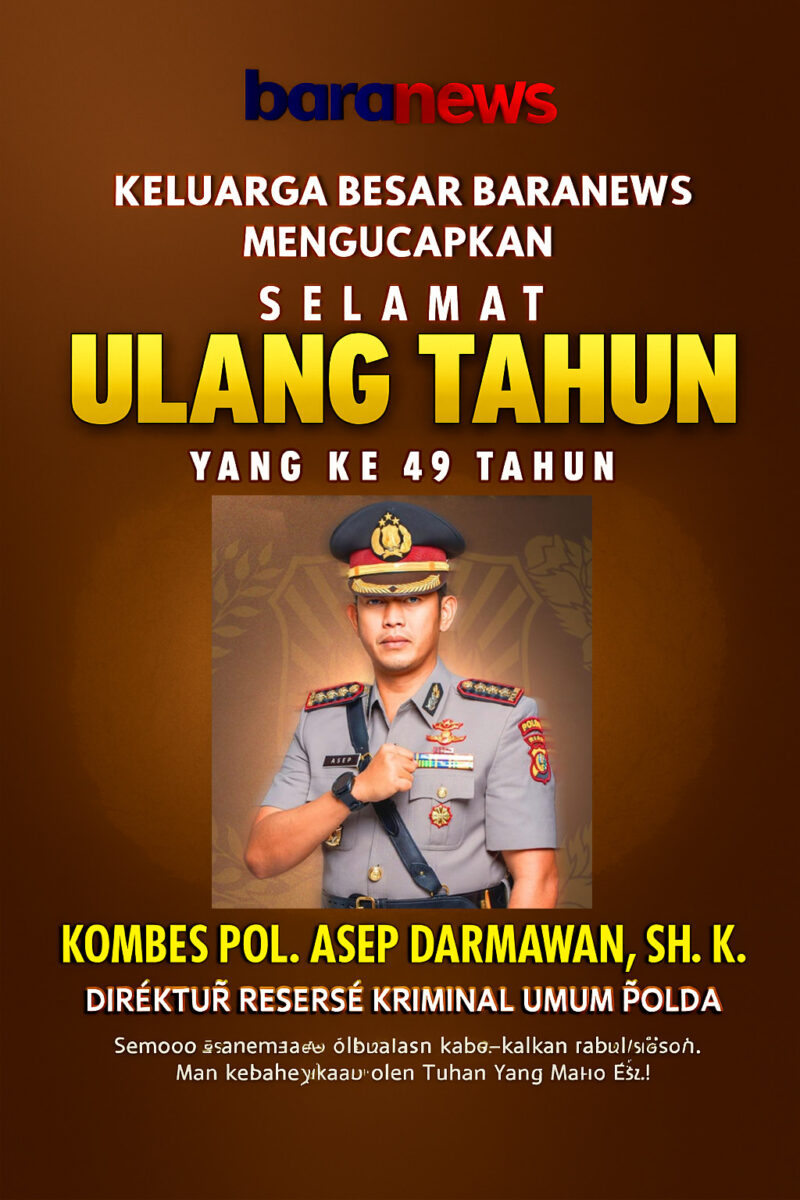 PEKANBARU — Keluarga besar Baranews menyampaikan ucapan selamat ulang tahun kepada Direktur Reserse Kriminal Umum (Dirreskrimum) Polda Riau, Kombes Pol Asep Darmawan, S.H., yang pada tahun ini genap berusia 49 tahun.