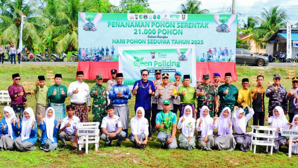 Selatpanjang-Riau, baranewsriau.com – Sempena Hari Pohon Sedunia 2025, Kepolisian Daerah (Polda) Riau dengan moto Green Policing, Melindungi Tuah Menjaga Marwah, telah melaksanakan penanaman pohon secara serentak sebanyak 21.000 batang. Hal ini juga dilaksanakan oleh Kepolisian Resor (Polres) Kepulauan Meranti. Pelaksanaan Acara Puncak Hari Pohon Sedunia 2025 di Kepulauan Meranti yang dipimpin oleh Kapolres Kepulauan Meranti, AKBP Aldi Alfa Faroqi, S.H., S.I.K., M.H., dilaksanakan di Halaman Gedung Perpustakaan Daerah Kepulauan Meranti, Jalan Perumbi, Selatpanjang, Jum’at (21/11/2025).