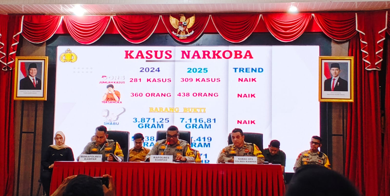 Di sisi lain, Polres Kampar juga memaparkan kinerja penindakan narkoba sepanjang 2025 dengan total 438 tersangka, sedangkan tahun 2024 hanya 360 tersangka.