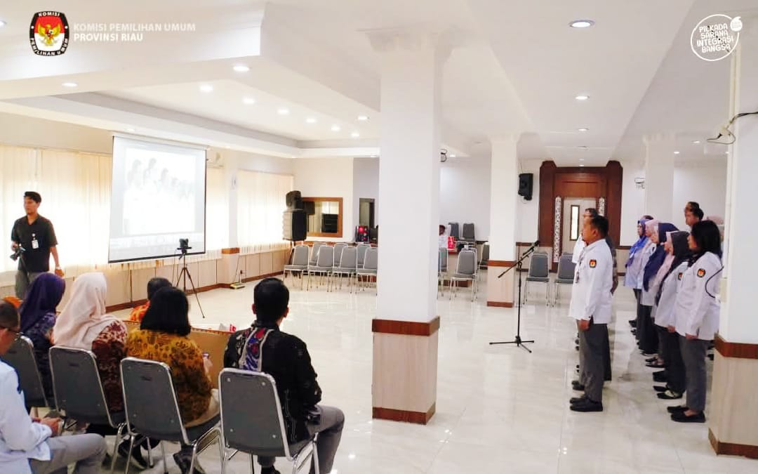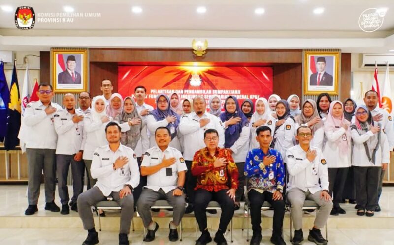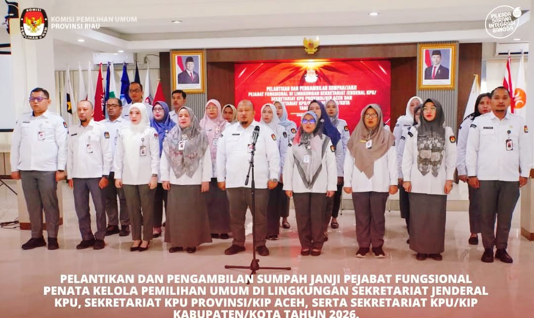 Pekanbaru, baranewsriau.com – Komisi Pemilihan Umum (KPU) melantik dan mengambil sumpah/janji Pejabat Fungsional Penata Kelola Pemilihan Umum di lingkungan Sekretariat Jenderal KPU, Sekretariat KPU Provinsi/KIP Aceh, serta Sekretariat KPU/KIP Kabupaten/Kota Tahun 2026. Kamis (22/01/2026).Pelantikan dipimpin oleh Sekretaris Jenderal KPU, Bernad Dermawan Sutrisno, dan dihadiri oleh Ketua KPU, Mochammad Afifuddin, secara luring dan daring. Dari KPU Provinsi Riau, pelantikan ini diikuti oleh 25 orang ASN.