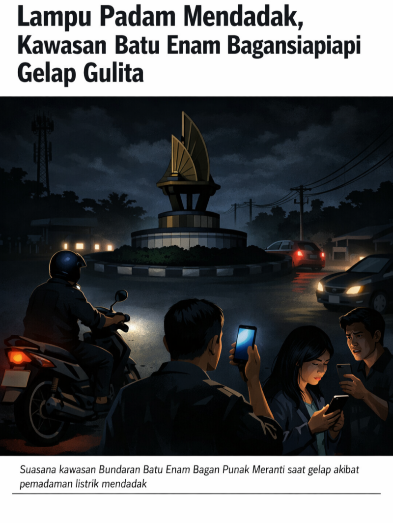 ROHIL, BARANEWSRIAU.com – Pemadaman listrik terjadi secara mendadak di kawasan Bundaran Batu Enam, Bagan Punak Meranti, Kecamatan Bangko, Kabupaten Rokan Hilir, Senin (5/1/2026) malam. Hingga pukul 23.43 WIB, listrik padam tanpa pemberitahuan sebelumnya dari pihak PLN.