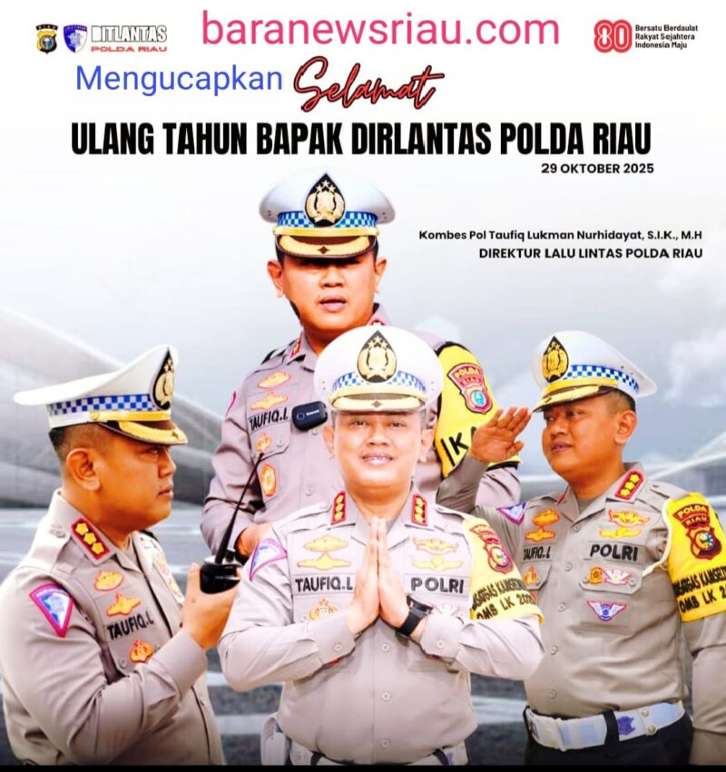 Pekanbaru, Media “baranewsriau.com” mengucapkan selamat ulang tahun kepada Bapak Dirlantas Polda Riau, Kombes Pol Taufik Lukman Nurhidayat, S.I.K., M.H., Semoga panjang umur, sehat selalu, dan semakin sukses dalam pekerjaannya sebagai pelayan masyarakat. Rabu (29/10/2025).