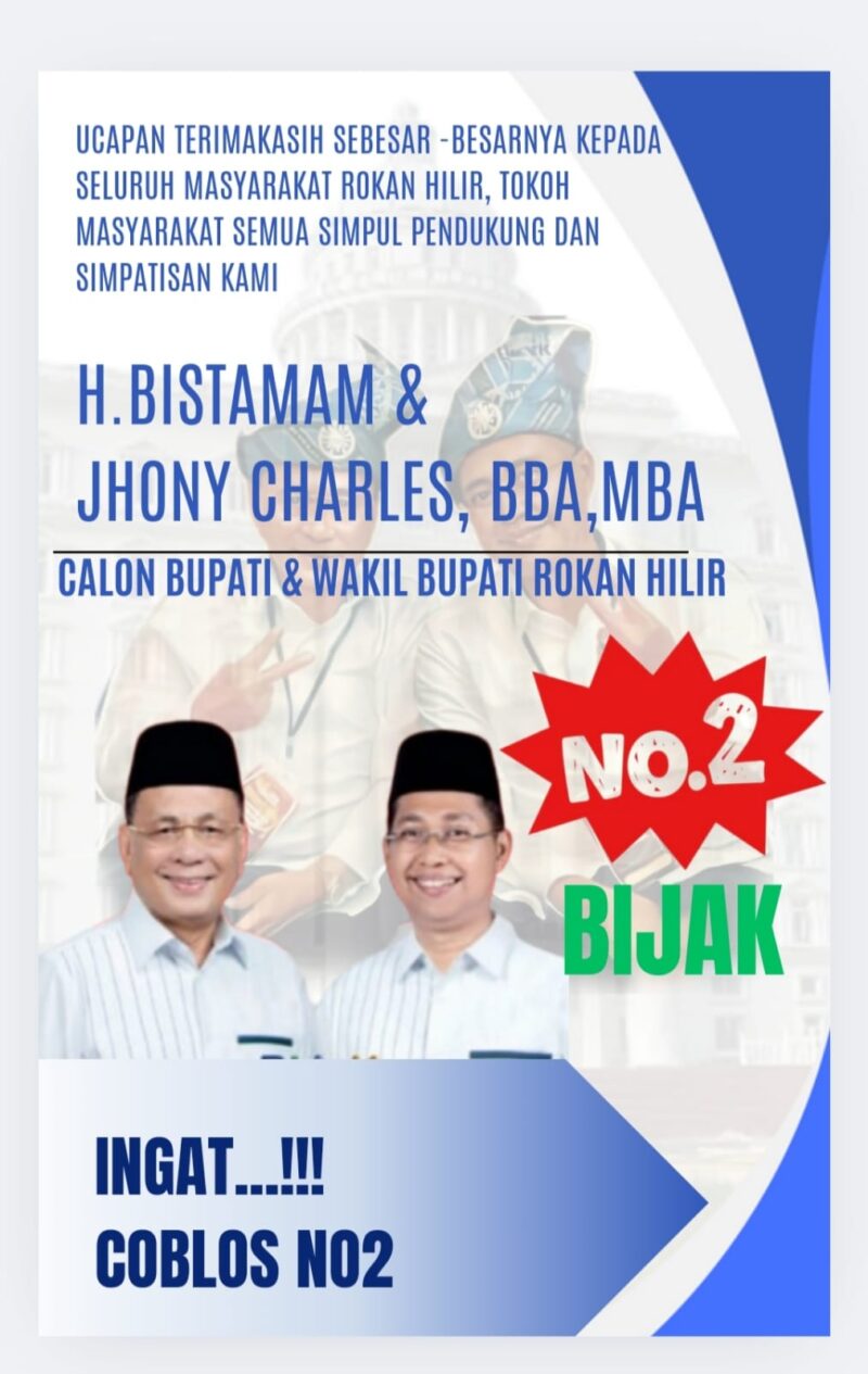 Dalam pesan tersebut, pasangan ini mengingatkan masyarakat untuk memilih pasangan nomor urut 2 dalam pemilihan mendatang dengan slogan “Bijak.” Dengan visi dan misi yang mereka bawa, H. Bistamam dan Jhony Charles optimis untuk mewujudkan Rokan Hilir yang lebih baik.