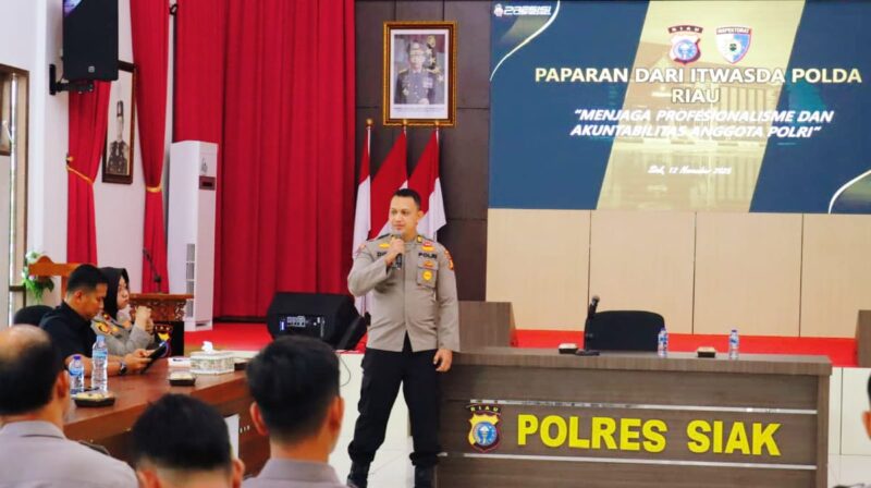 Siak-Riau, baranewsriau.com – Dalam upaya memperkuat profesionalisme dan mencegah pelanggaran etika serta penyalahgunaan wewenang di lingkungan Kepolisian, Polda Riau melalui Bidpropam, Itwasda, Biro SDM, Bidkum, dan Ditresnarkoba menggelar kegiatan “Pembinaan Etika Profesi Polri Guna Mencegah dan Mitigasi Penyimpangan yang Dilakukan oleh Anggota Polri”, Rabu (12/11/2025), bertempat di Gedung Endra Dharma Laksana Polres Siak.Kegiatan yang berlangsung sejak pukul 08.30 WIB ini dihadiri oleh Kapolres Siak AKBP Eka Ariandy Putra, S.H., S.I.K., M.Si., Wakapolres Siak Kompol Akira Ceria, S.I.K., M.M., serta sejumlah pejabat utama dan perwakilan dari Polda Riau, antara lain Kompol Yudi Setiawan, S.H., M.H., (Kaurbinetika Subbid Wabprof Bidpropam Polda Riau), AKP Didik Susantoputro, S.H., (Parik Itbid 1 Itwasda Polda Riau), AKP Dr. Mardiwel, S.H., M.H., (PS. Kanit 3 Bag Wassidik Ditresnarkoba Polda Riau), IPTU Oki Mahendra, S.Psi., (PS. Paur Subbagsipers Biro SDM Polda Riau), IPTU Yusran P. Chery, S.H., M.H. (Pamin 1 Urren Subbagrenmin Bidkum Polda Riau), dan IPTU Keken Abdimas Putra, S.H., (PS. Kanit Riksa 2 Subbid Provos Bidpropam Polda Riau).