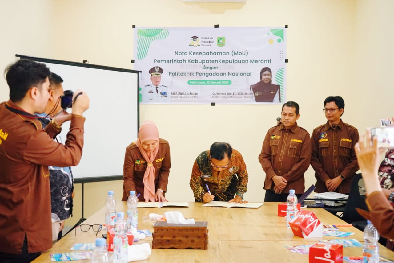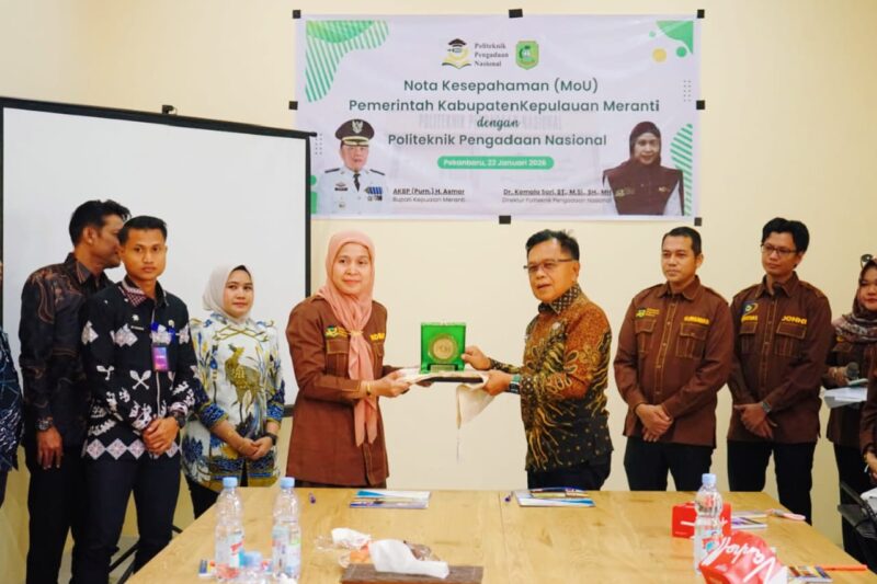 Pekanbaru, baranewsriau.com –Pemerintah Kabupaten Kepulauan Meranti resmi menjalin kerja sama dengan Politeknik Pengadaan Nasional (Polteknas) Pekanbaru dalam rangka penguatan sumber daya manusia (SDM), khususnya di bidang Pengadaan Barang dan Jasa (PBJ). Kerja sama tersebut ditandai dengan penandatanganan Nota Kesepahaman (MoU) di Aula Polteknas Pekanbaru, Jalan Semangka, Kamis (22/1/2026).