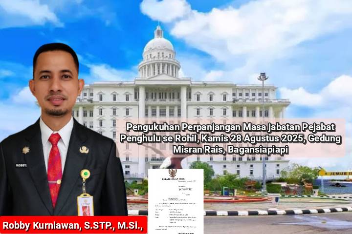 Plt. Kepala Dinas Pemberdayaan Masyarakat Kepenghuluan Rohil, Robby Kurniawan, S.STP., M.Si., menyampaikan pengukuhan perpanjangan masa jabatan pejabat penghulu akan digelar pada Kamis 28 Agustus 2025, sekira pukul 14:00 WIB, bertempat di Gedung Misran Rais Bagansiapiapi.