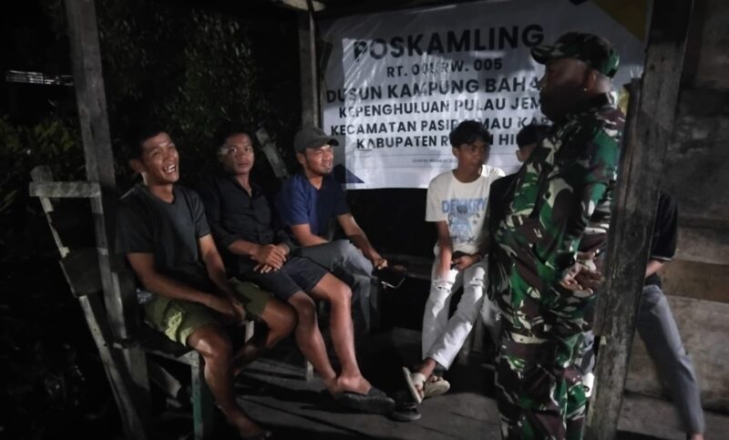 Rohil -baranews,——- Sebagai upaya penguatan Binter dan menumbuh kembangkan kegiatan siskamling di Desa Binaan, Personil Koramil 04/Kubu dpp Serda Masrianto bersama warga melaksaksanakan kegiatan Patroli Siskamling.