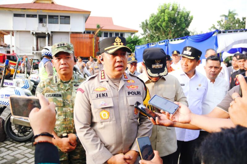 Pekanbaru,  baranewsriau.comPolresta Pekanbaru menggelar Apel Gelar Pasukan Operasi Lilin Lancang Kuning 2025 pada Jumat (19/12/2025) sekitar pukul 16.30 WIB di Halaman Mall Pelayanan Publik (MPP) Jalan Jenderal Sudirman, Kota Pekanbaru. Apel ini dilaksanakan sebagai bentuk kesiapan dalam rangka pengamanan perayaan Natal 2025 dan Tahun Baru 2026 (Nataru). Jumat (19/12/2025).Apel gelar pasukan dipimpin langsung oleh Wali Kota Pekanbaru H. Agung Nugroho, S.E., M.M., didampingi Kapolresta Pekanbaru Kombes Pol Jeki Rahmat Mustika, S.I.K., M.H., serta Komandan Kodim 0301/Pekanbaru Kolonel Inf Ikhsanuddin, S.Sos., M.M., Turut hadir unsur Forkopimda serta perwakilan instansi terkait.Dalam kegiatan tersebut, sebanyak 413 personel gabungan dikerahkan, terdiri dari: