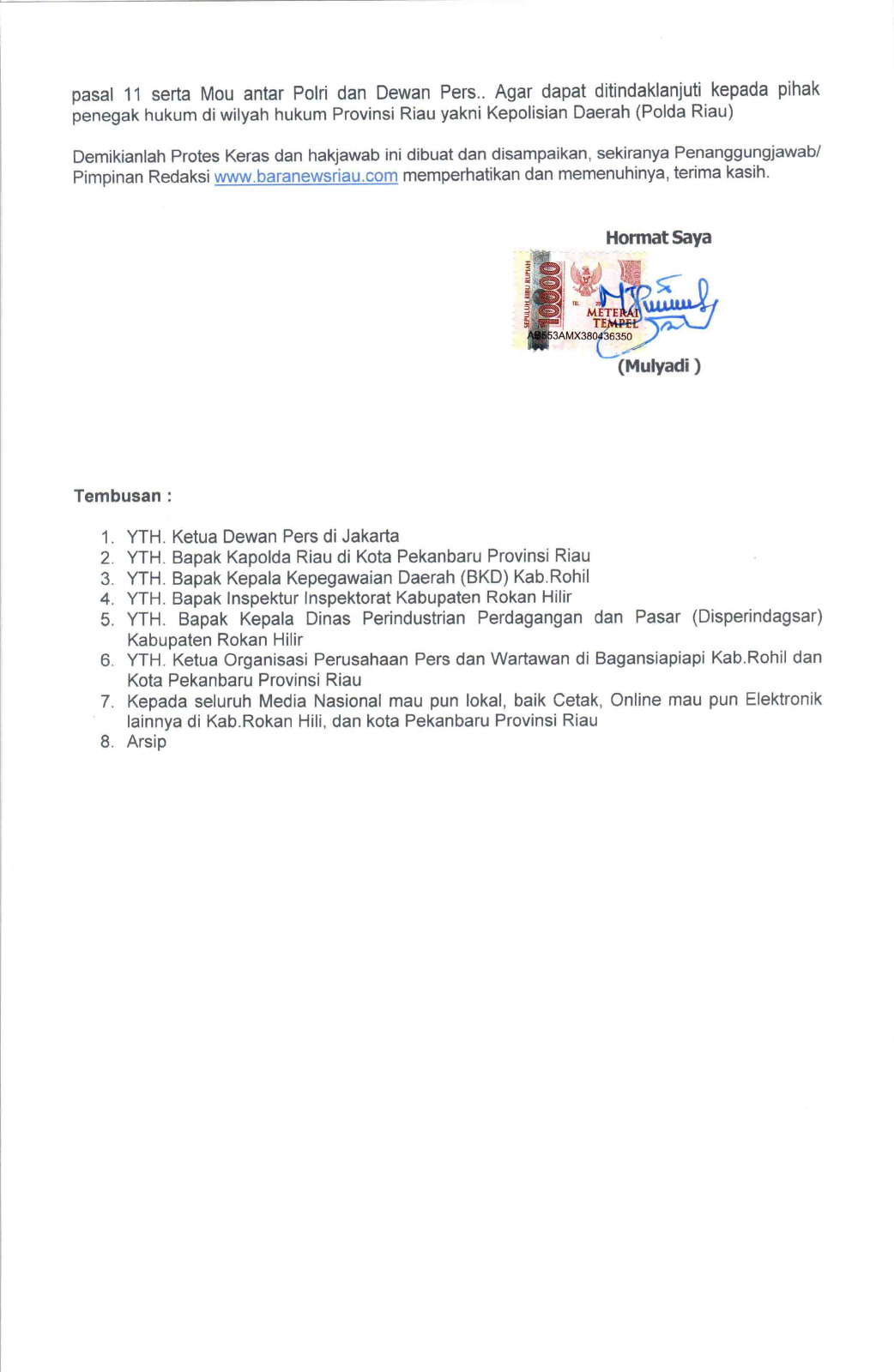 Demikianlah Protes Keras dan hak jawab ini dibuat dan disampaikan,sekiranya Penanggungjawab/ Pimpinan Redaksi www.baranewsriau.com memperhatikan dan memenuhinya,terimakasih .**