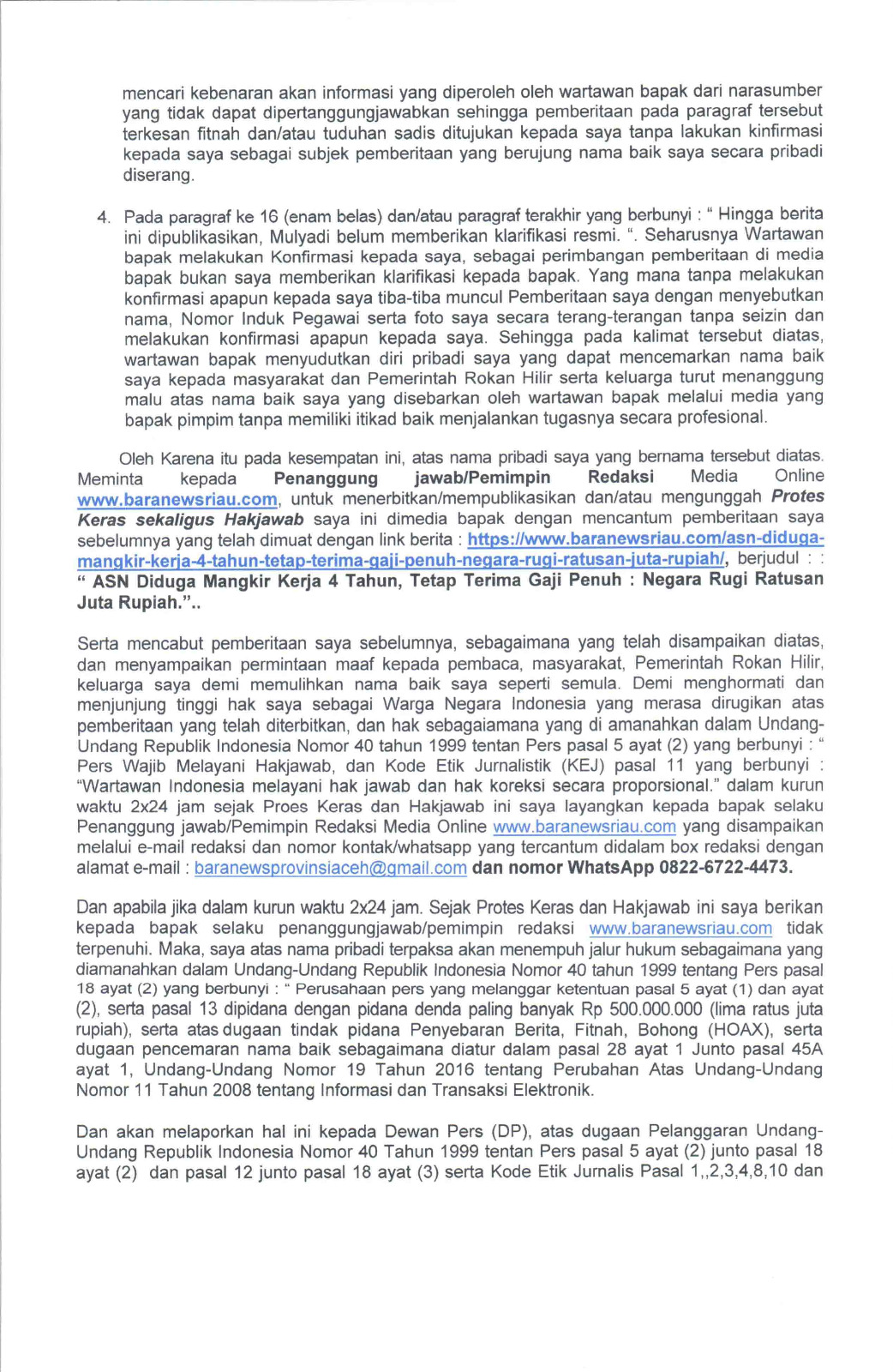 Oleh Karena itu pada kesempatan ini,atas nama pribadi saya yang bernama tersebut diatas. Meminta kepada Penanggung jawab/Pemimpin Redaksi Media Online www.baranewsriau.com, untuk menerbitkan/mempublikasikan dan/atau mengunggah Protes Keras sekaligus Hakjawab saya ini dimedia bapak dengan mencantum pemberitaan saya sebelumnya yang telah dimuat dengan link berita: https://www.baranewsriau.com/asn-diduga: mangkir-keria-4-tahun-tetap-terima-gaji-penuh-negara-rugi-ratusan-juta-rupiahl,berj udul: