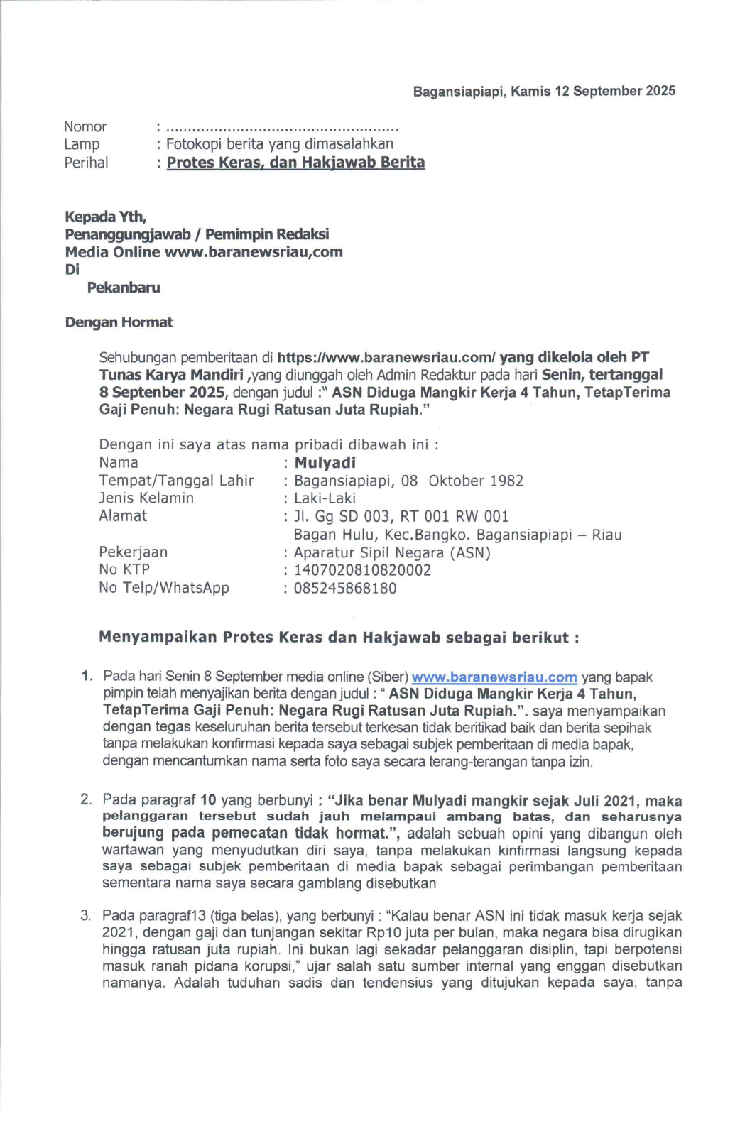 Redaksi hari Jum’at 12 September 2025 menerima surat dengan perihal protes keras dan hak jawab dari Mulyadi ASN disperindagsar Rohil alamat jalan SD negeri 03 RT/01, RW/01 Bagan hulu kecamatan Bangko kabupaten Rokan Hilir provinsi Riau.