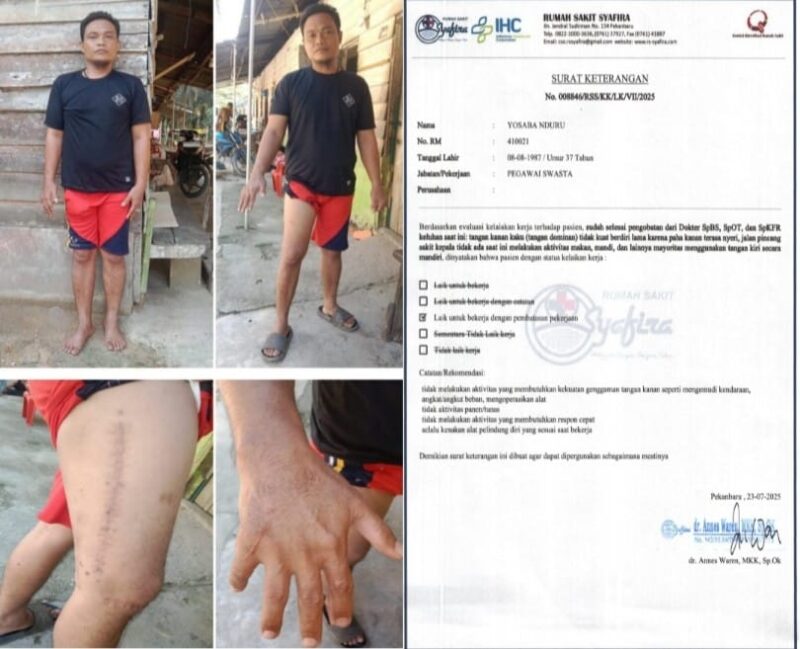 “Kejadian awalnya pekerja Yosaba Nduru ini telah terjadi kecelakaan kerja pada tanggal 6 April tahun 2023, mengakibatkan kaki patah (panjang pendek), dan seluruh jari atau tulang telapak tangan sebelah kanan patah alias cacat total yang mengakibatkan telapak tangan tidak dapat digumpalkan dan beberapa penyakit lain, sejak dari situ Yosaba Nduru sudah tidak bisa bekerja lagi seperti biasanya.