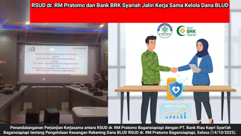 BAGANSIAPIAPI, Baranewsriau.com| Rumah Sakit Umum Daerah (RSUD) dr. RM Pratomo Bagansiapiapi menjalin kerja sama dengan Bank Riau Kepri (BRK) Syariah Cabang Bagansiapiapi dalam pengelolaan keuangan rekening Dana Badan Layanan Umum Daerah (BLUD). Penandatanganan perjanjian kerja sama dilakukan di Aula RSUD dr. RM Pratomo, Selasa (14/10/2025).