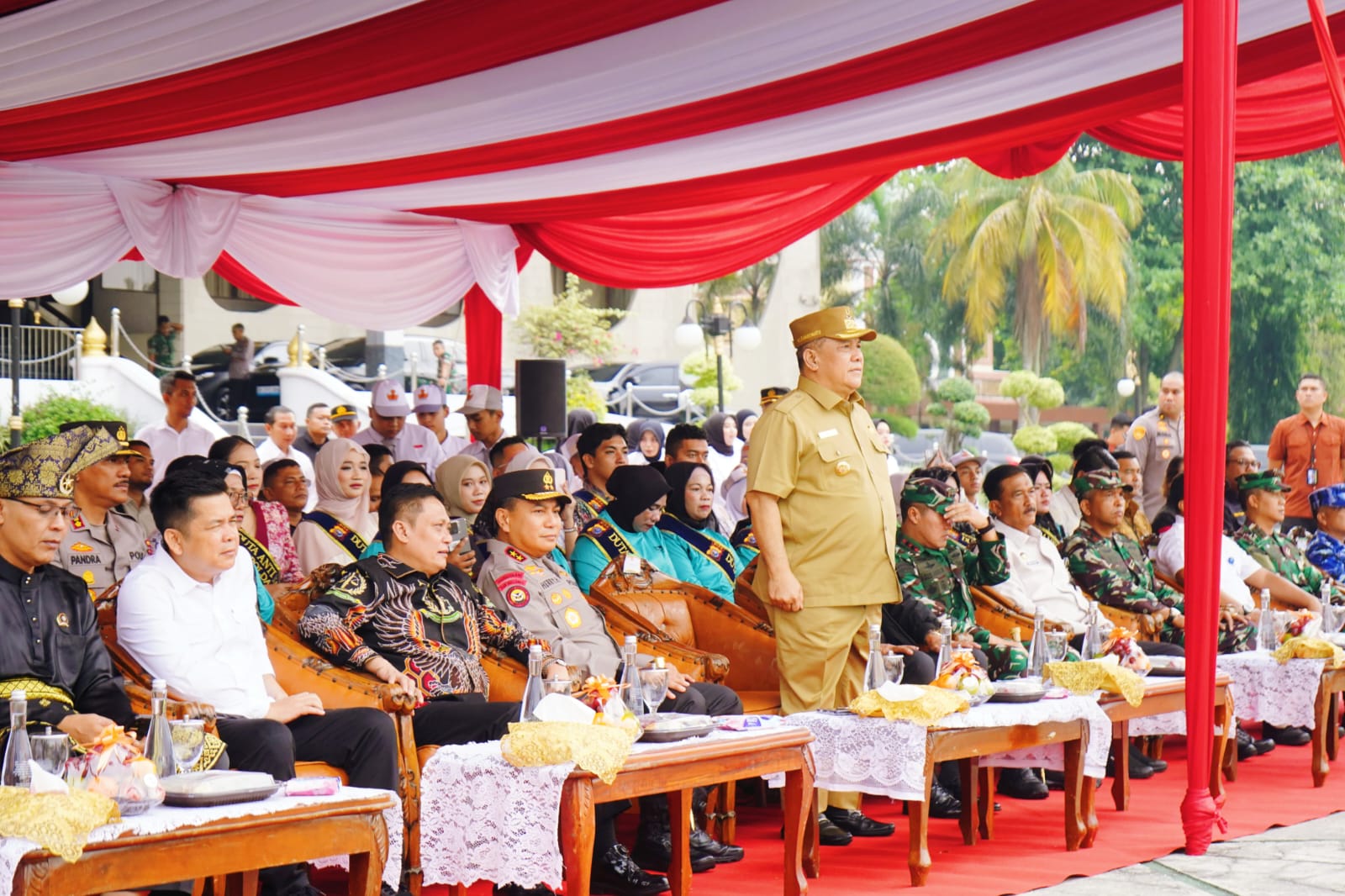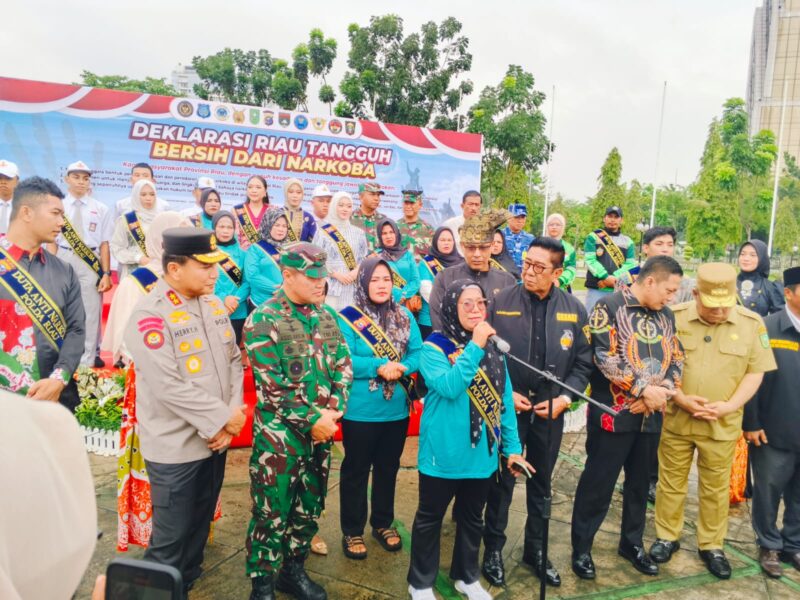 Pekanbaru, baranewsriau.comLapangan Kantor Gubernur Riau mendadak penuh semangat, Ibu-ibu Panipahan diangkat jadi Duta Anti Narkoba,Sabtu (25/4/2026). Pemerintah Provinsi Riau bersama Polda Riau dan seluruh unsur Forkopimda menggelar Apel Kesiapan Satgas Anti Narkoba Provinsi Riau. Apel dipimpin langsung Plt Gubernur Riau SF. Harianto. Minggu (26/04/2026).Hadir lengkap jajaran penegak hukum dan pemerintah. Tampak Kapolda Riau Irjen Pol Dr. Herry Heryawan, Pangdam XIX/Tuanku Tambusai, Kajati Riau, Danrem 031/WB, Pejabat Utama Polda Riau, Danlanud RSN diwakili Dansatpom & Kadis Ops, Kabinda Riau diwakili Kabag Ops, Danlanal Dumai, serta BNNP Riau diwakili Kabid Pemberantasan dan Intelijen Kombes Pol Dr. Ali Machfud. Turut hadir LAM Riau diwakili Sekretaris DPH Datuk Toni Werdiansyah, Ketua Umum DPP Granat, Dr. H. KRH. Henry Yosodiningrat, S.H., M.H., dan DPD Granat Riau Fredy Simanjuntak.Rangkaian kegiatan apel berlangsung khidmat, diawali dengan laporan Komandan Apel, Penghormatan pasukan, hingga pemasangan ROMPI SATGAS Anti Narkoba sebagai simbol sesiangan.Dalam arahannya, Kapolda Riau Irjen Pol Dr. Herry Heryawan menegaskan perang melawan narkoba tidak bisa dilakukan sendiri.
