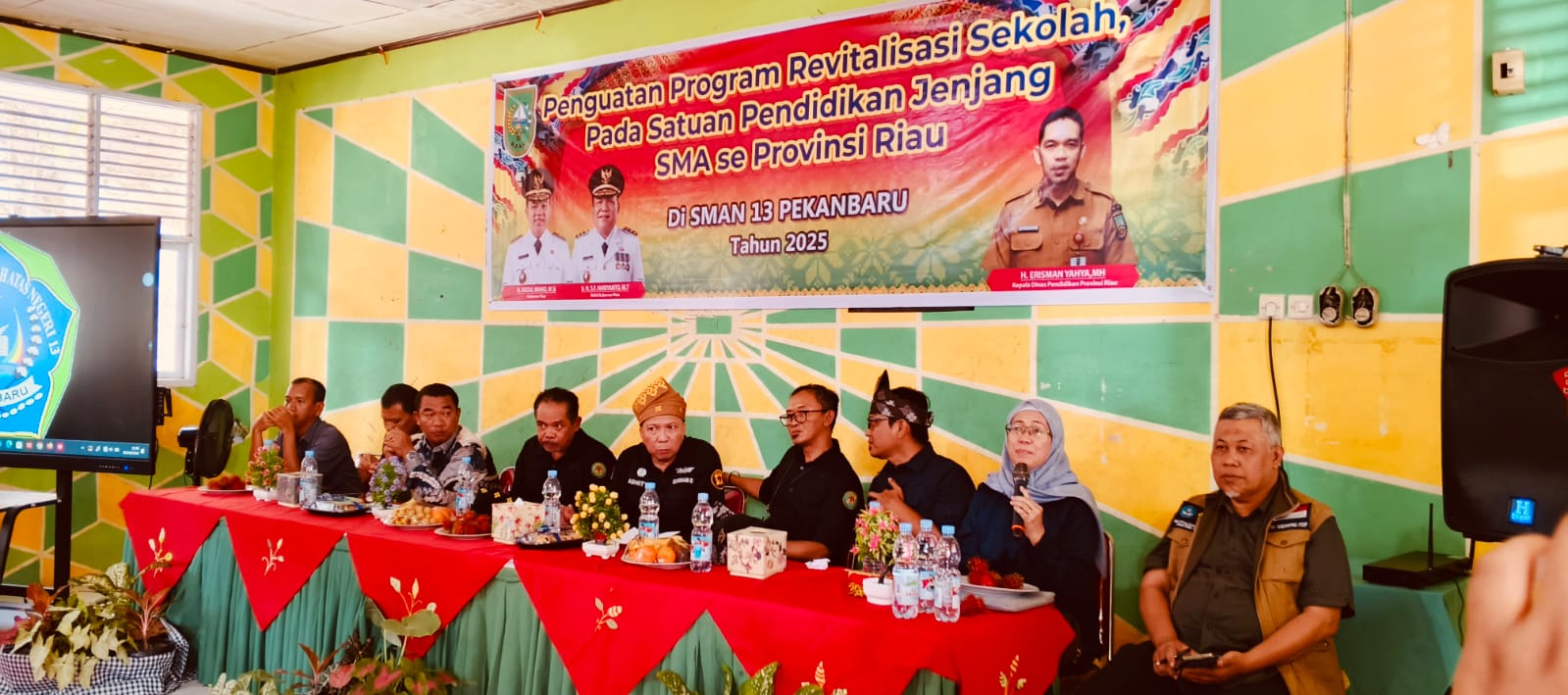 Pekanbaru, baranewsriau.com – Perdana Kunjungan ke- SMA Negeri 13 Pekanbaru, menjadi salah satu sekolah yang dikunjungi dalam rangka penguatan program Revitalisasi Sekolah pada satuan pendidikan jenjang SMA se-Provinsi Riau. Kamis (23/10/2025). Kepala Sekolah Pak Benny Rio Denaldy, M.Si.,menyampaikan rasa terimakasih atas kunjungan pejabat dari Dinas Pendidikan Provinsi Riau, yang diwakilkan dengan Bapak Kabid SMA, Dr. Nasrol Akmal, Kejaksaan Agung RI, Adhitya, S.H., M.H., Kejaksaan Tinggi Riau yang diwakilkan oleh Bapak Didik Hariadi, S.H., Tim Revitalisasi SMA Provinsi Riau Pendamping dari Unri, Ir. Agus Ika Putra, Dipl., Eng., M.Phil., bersama jajarannya dan Kementerian Dinas Pendidikan Dasar dan Menengah, Bapak Jim Bar Pen, S.H., M.A.P., dengan Ibu Beryana Evridawati, S.Pt., M.Pd., serta BPMP, yang juga diwakilkan oleh Bapak Niger Balbara, S.Kom., M.T.