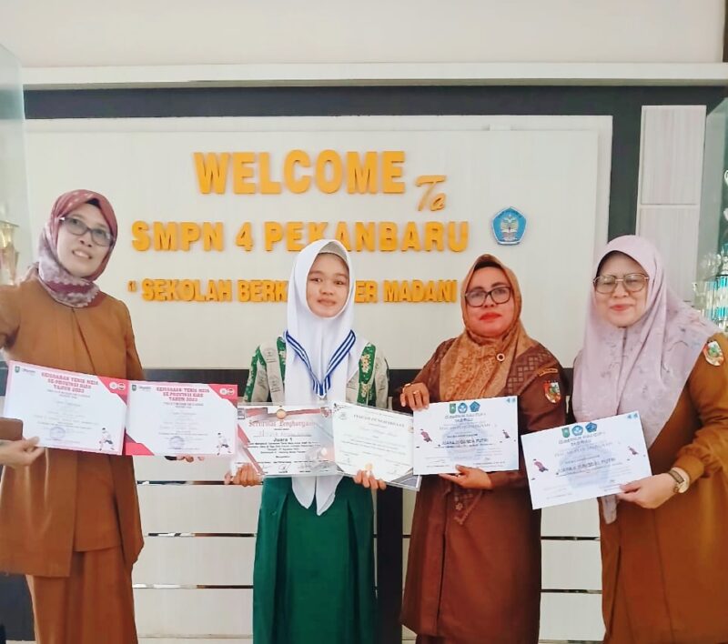 Pekanbaru, baranewsriau.com – Kepala Sekolah, Kepala Tata Usaha, para guru, serta seluruh siswa-siswi SMP Negeri 4 Pekanbaru dengan penuh kebanggaan memberikan ucapan selamat dan doa terbaik kepada Naura Adhisya Ilham, siswi berprestasi yang akan mengikuti Pelatnas (Pemusatan Latihan Nasional) di Bogor. Selasa (4/11/2025).
