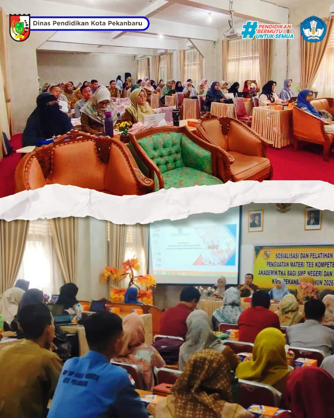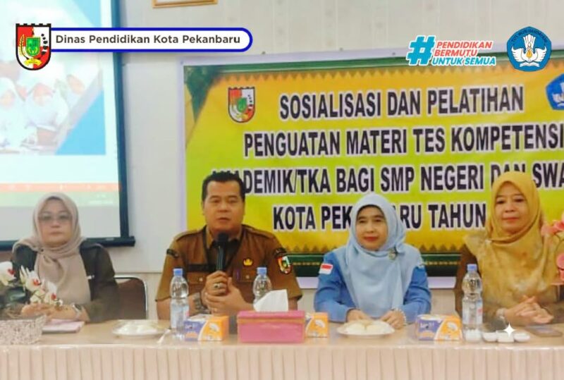 Pekanbaru,  baranewsriau.comKepala Bidang SMP, Dr. Irpan Maidelis, S.Pd., M.M., didampingi oleh Kasi Kurikulum SMP, membuka kegiatan Sosialisasi dan Pelatihan Penguatan Materi Tes Kompetensi Akademik (TKA) bagi guru Bahasa Indonesia dan Matematika SMP Negeri dan Swasta Kota Pekanbaru. Kegiatan ini dilaksanakan di SMPN 1 Pekanbaru pada Selasa, (20/01/2026).Sosialisasi dan pelatihan ini bertujuan untuk meningkatkan kemampuan dan kompetensi guru dalam mengajar dan mempersiapkan siswa untuk menghadapi TKA.