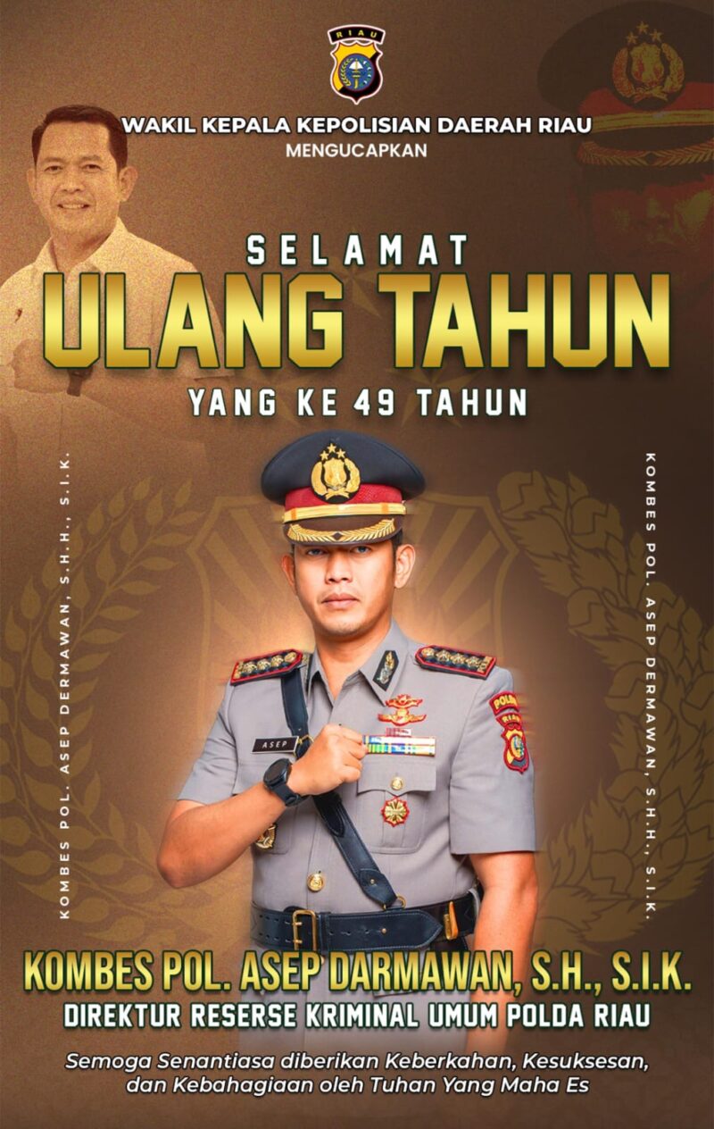 Ucapan tersebut disampaikan melalui media publikasi resmi, menampilkan potret Kombes Asep dalam balutan seragam dinas lengkap dengan pangkat melati tiga di pundaknya. Dalam pesan tersebut, Wakapolda Riau mendoakan agar sang Direktur Reskrimum senantiasa memperoleh keberkahan, kesuksesan, dan kebahagiaan dari Tuhan Yang Maha Esa.